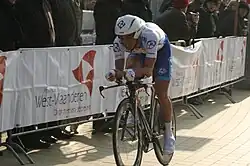 Three days later, Rollin finished tenth in Dwars door Vlaanderen.[32] Bonnet finished sixth in the succeeding E3 Prijs Vlaanderen – Harelbeke three days later,[33] after making his way into the breakaway, with Chainel also making it into a secondary breakaway from the main field after pressure from the Garmin–Cervélo squad. He eventually finished the race 15th.[33] At the beginning of April, Meersman earned his second runner-up placing in the space of three weeks, finishing behind Renaud Dion (Bretagne–Schuller) in Route Adélie; Meersman had been one of seven riders in contention for victory in a breakaway in the closing stages.[34][35] Meersman followed up that performance two days later, in the inaugural Flèche d'Emeraude, by finishing fourth in the final mass sprint.[34] Hutarovich finished third in the Scheldeprijs three days later,[36] having avoided a crash in the finishing straight which eliminated several riders from contention for the top placings. Casar won Paris–Camembert later in April, by making a late ten-rider selection which included teammate Fédrigo, who worked to set Casar up for a sprint on the uphill finish. Casar was easily the strongest, ahead of Romain Hardy and Julien Antomarchi.[37]