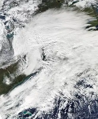As the system moved to the northeast through the day, it produced widespread snow and winds near hurricane-strength north of the cyclone's warm front over the open waters of the Atlantic Ocean.[15] Winds as high as 69 mph (111 km/h) were observed in Massachusetts,[16] and the National Weather Service, issued a Hurricane Force Wind Warning for the Gulf of Maine and other high seas off New England.[17] Overnight into October 30, the storm passed south of Nantucket, and it moved over Nova Scotia later that day with a barometric pressure of 975 mb (28.8 inHg). As it did so, the associated precipitation diminished over New England and moved into Atlantic Canada.[1] As the system moved out into the Atlantic Ocean, it reached a minimum barometric pressure of 971 mb (28.7 inHg) as it passed to the east of the island of Newfoundland late on October 31.[18] By the early morning of November 1, the system had fully moved out to sea.[19] The storm then hit the UK as Cyclone Quinn.