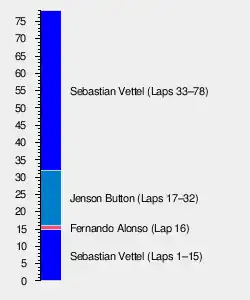 After Petrov was extracted from his car and the track cleared, the race resumed still behind the safety car, which went in at the end of lap 73. On lap 74 there was a brief yellow flag period due to an incident between Hamilton and Maldonado, ending Maldonado's race with a broken front suspension. Vettel took the chequered flag, extending his lead in the world championship to 58 points. Vettel was closely followed by Alonso in second, with Button taking the final podium spot.[12]