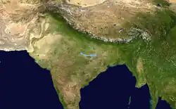 On July 21 as the Madden–Julian oscillation entered its fifth phase, the Bay of Bengal became favourable for tropical cyclogenesis.[20] As a result of this and an upper tropospheric cyclonic vortex, an area of low pressure developed on July 21, over the Gangetic West Bengal about 50 km (30 mi) to the southeast of Daltonganj.[20] During the next day the IMD reported that the low-pressure area had intensified into a land depression, with peak 3-minute sustained windspeeds of 35 km/h (20 mph).[20] During that day, the depression moved towards the northwest under the influence of a monsoon trough before it weakened into a low-pressure area during July 23.[21] Under the influence of the system, the Indian states of Madhya Pradesh, Rajasthan, Gujarat, Chhattisgarh and Vidarbha saw widespread heavy rainfall, however, no economic damage was reported.[20]