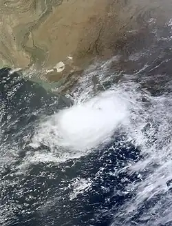 Under the influence of a low-level trough, a low-pressure area formed over the Arabian Sea in late October. The system organized and the IMD designated the system Depression "ARB 02".[35] The depression moved toward the Middle East during the next few days and intensified into a Deep Depression on November 1.[36] In the morning of November 2, IMD upgraded the deep depression into a cyclonic storm and assigned it the name Keila.