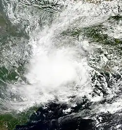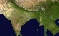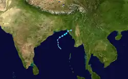 Late on September 20, an area of low pressure developed approximately 200 nautical miles (370 km; 230 mi) south of Chittagong, Bangladesh.[22] Under the influence of strong vertical wind shear and monsoonal activity in the Bay of Bengal, the system was unable to strengthen and the JTWC later reported that the system had dissipated.[23] However, on September 22, the IMD started monitoring the system as a Depression and initiated bulletins on the system, designating it BOB 03.[24] Late on that day, BOB 03 drifted northwest and made landfall over north Orissa close to Balasore.[25] After moving further northwestwards, the depression remained practically stationary over Jharkhand. By the evening of September 23, IMD reported that the depression had weakened into a well-marked low-pressure area in their final bulletin for the system, as the storm dissipated to a remnant low.[26]