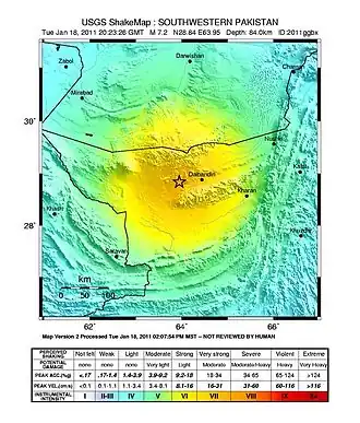 The 2011 Dalbandin earthquake occurred on 19 January at 01:23 a.m. local time with a moment magnitude of Mw 7.2 and a maximum Mercalli intensity of VII (Very strong). The shock occurred in a sparsely populated area of Balochistan, caused moderate damage, three deaths, and some injuries.