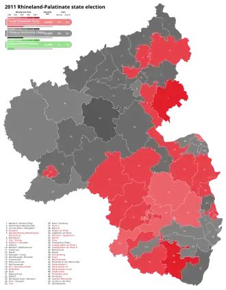 The 2011 Rhineland-Palatinate state election was held on 27 March 2011 to elect the members of the Landtag of Rhineland-Palatinate. The incumbent Social Democratic Party (SPD) government led by Minister-President Kurt Beck lost its majority. The SPD subsequently formed a coalition with The Greens, and Beck continued in office.[1]