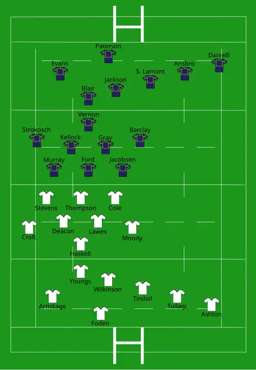 | Try: Ashton 78' c Con: Flood (1/1) Pen: Wilkinson (2/5) 34', 63' Drop: Wilkinson (1/2) 57' | Report[10] | Pen: Paterson (2/2) 9', 55' Parks (1/1) 17' Drop: Parks (1/3) 40+' |