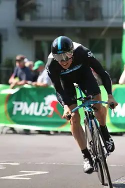 Appollonio took his first victory as a professional during June's Tour de Luxembourg, winning a bunch sprint into Roost.[56] A fifth-place finish the following day, on the final stage, ensured that Appollonio won the points classification, taking the jersey from Team Katusha rider Denis Galimzyanov.[57] Consistent finishing from Wiggins at the Critérium du Dauphiné earned the team their first overall race win at World Tour level. After finishing third in the opening prologue, Wiggins placed second behind Tony Martin (HTC–Highroad) on the third stage time trial, held over the course that would later be used for the penultimate day time-trial of the Tour de France, to take the overall lead by over a minute from nearest challenger, BMC Racing Team's Cadel Evans.[58] Wiggins took sixth-place finishes on stages 5 and 6, and with a tenth place on the final stage, secured the overall win by 86 seconds ahead of Evans.[59] Boasson Hagen also added World Tour points with third behind Wiggins in the time trial, and second to HTC–Highroad rider John Degenkolb on stage 4.[60]
