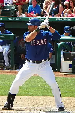During the offseason, Chuck Greenberg, who purchased the Rangers from Tom Hicks during the 2010 season along with Nolan Ryan, sold his interest in the team to Ryan, making him the Rangers' principal owner.[16] Notable player departures during the offseason included pitcher Cliff Lee and outfielder/designated hitter Vladimir Guerrero (both to free agency) and catcher Bengie Molina, who retired. Notable free agent additions during the offseason included pitchers Yoshinori Tateyama and Brandon Webb, catcher Yorvit Torrealba, and third-baseman Adrián Beltré. In January 2011, as part of a three-way trade with the Toronto Blue Jays and Los Angeles Angels of Anaheim, the Rangers acquired catcher Mike Napoli in exchange for pitcher Frank Francisco. During the season, the team acquired pitcher Koji Uehara from the Baltimore Orioles in exchange for infielder Chris Davis, and Mike Adams from the San Diego Padres in exchange for two minor-league pitchers. Pitcher Arthur Rhodes was released and signed with the St. Louis Cardinals days later; as a result, Rhodes would have been entitled to receive a World Series ring regardless of which team won.[17][18]