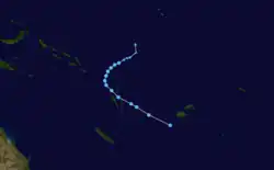 On December 9, RSMC Nadi started to monitor a weak tropical depression, that had developed within the South Pacific convergence zone, about 700 km (435 mi) to the northeast of Suva, Fiji.[20][21] Over the next two days, the depression gradually developed further in an area of low vertical windshear and favourable sea surface temperatures, as it was steered eastwards by an upper level ridge of high pressure.[21][22][23] During December 11, the JTWC started to issue warnings and designated the system as Tropical Cyclone 04P, after 1-minute sustained winds had become equivalent to a tropical storm.[23] RSMC Nadi then reported early the next day that the system had become a category one tropical cyclone and named it Evan, while it was located about 410 km (255 mi) to the west of Pago Pago on the American Samoan island of Tutuila.[24][25]
