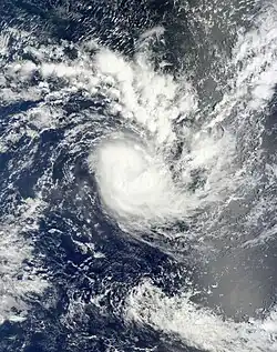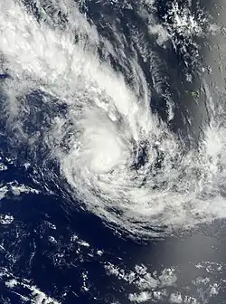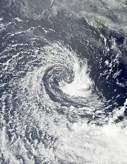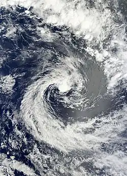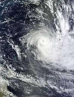 During December 30, Freda continued to intensify further, before RSMC Nadi reported that Freda had peaked as a category 4 severe tropical cyclone with 10-minute sustained windspeeds of 185 km/h (115 mph).[40][44] The JTWC subsequently followed suit and reported that Freda had peaked with 1-minute sustained windspeeds of 205 km/h (125 mph) which made it equivalent to a category 3 hurricane on the SSHS.[45] After it had peaked, Freda started to quickly weaken as it continued to move towards the south-southeast, as vertical windshear over the system increased and caused convection over Freda's northern semicircle to gradually wear away.[46] By 0000 UTC on January 1, the JTWC reported that Freda had become equivalent to a category one hurricane, while RSMC Nadi had reported that the system had weakened into a category 2 tropical cyclone.[45][47] Throughout that day, Freda continued to weaken before at 1800 UTC after deep convection had become displaced to the east of the low level circulation center, RSMC Nadi reported that the cyclone had weakened into a tropical depression.[48] During the next day the JTWC issued their final advisory on the system after the low level circulation center had become fully exposed before the remnant tropical depression crossed the northern part of New Caledonia's Grande Terre Island.[40][49][50] After crossing New Caledonia's biggest island, Freda started to move towards the southeast between Grande Terre and the Loyalty Islands, while the JTWC reported that Freda had become a subtropical cyclone, as it was positioned under a strong subtropical westerly flow.[45][51] The remnant depression was subsequently last noted during January 4, as it dissipated about 630 km (390 mi) to the southwest of Nadi, Fiji.[45][52]