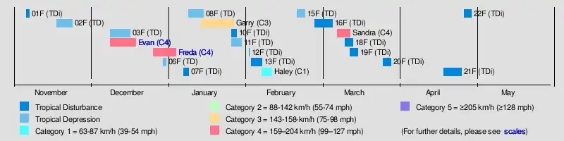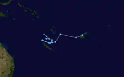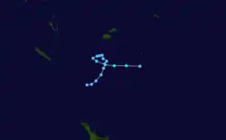 The first tropical disturbance of the season developed on November 6, to the southwest of Suva, Fiji which moved towards the southeast over the next day before it was last noted during the next day as it moved out of the tropics.[5][6] Tropical Disturbance 02F subsequently developed on November 18 to the northeast of Port Vila, Vanuatu and over the next few days slowly moved to the west-southwest while gradually developing further. The system almost developed into a weak tropical cyclone as it moved along the Vanuatu Islands causing some locally heavy rain, minor damage and flash flooding, before it was last noted November 24 as it moved out of RSMC Nadi's area of responsibility.[7] After 02F left the tropics, the basin remained quiet until early December when the Australian monsoon pushed eastwards along the South Pacific convergence zone, and a Madden–Julian oscillation caused an increase in tropical cyclone activity.[7][8] On December 9, RSMC Nadi started to monitor the precursor systems to Tropical Depression 03F and Severe Tropical Cyclone Evan.