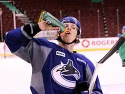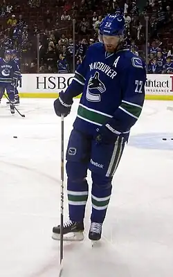 With training camp starting on January 13, 2013, Vancouver recalled 12 players from the Wolves.[38][39] They also bolstered their defence corp by signing NHL veterans Jim Vandermeer and Cam Barker to one-year contracts.[40] At the forward position, the Canucks were dealing with injuries to their second line. Centre Ryan Kesler, who was recovering from off-season surgeries to his shoulder and wrist, would be unable to start the season; it was unknown how long he would be out rehabbing the injuries.[41] Winger David Booth was injured during the team's physicals to start camp.[42] After having an MRI done on his injury, it was announced that Booth would miss four to six weeks recovering.[43] Alain Vigneault stated that he hoped to keep his third and fourth lines intact, leaving the possible replacements as, Andrew Ebbett, Jordan Schroeder and Zack Kassian. Schroeder was a first-round draft pick for Vancouver in 2009, but had never played in an NHL game. Ebbett a utility, journeyman forward played in 18 games for Vancouver in 2011–12. While the second-year Kassian produced only four goals in his rookie campaign.[44] Vancouver elected to start the season with Ebbett and put Kassian on their second line.[45] In order to keep defensive depth, the Canucks decided to keep nine defenceman. Schroeder was sent back to the minors in order to comply with the 23-man roster and because he would not need to clear waivers.[46]