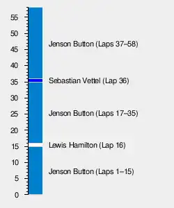 The 58-lap race was won by McLaren driver Jenson Button who took his third victory at the Albert Park Circuit. Reigning double World Champion Sebastian Vettel, driving for Red Bull Racing, finished in second place, while polesitter and Button's McLaren teammate Lewis Hamilton completed the podium.[5][6]