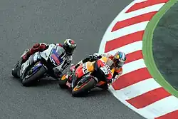 On lap 11, Pedrosa retook the lead from Lorenzo on the main straight, while Dovizioso remained close behind the pair. On the following lap, whilst trying to regain the position, Lorenzo overshot at the corner and was forced to ride across the kerbs to avoid the gravel.[9] Dovizioso fell back to the ongoing battle between Stoner and Crutchlow on lap 15, whilst another battle between Bautista (sixth) and Rossi (seventh) began to catch up.[11] After numerous attempts, Lorenzo managed to pass Pedrosa again to take the lead of the race with 6 laps remaining with a manoeuvre down the inside of turn 10.[12] Pedrosa had a large, unintentional wheelie entering the corner due to problems with his bike, possibly allowing the pass to happen.[13] The two riders now had a large lead over everyone else, but Pedrosa began to fall back from Lorenzo in the final three laps. On the 23rd and penultimate lap, Ben Spies managed to return into the top 10 by overtaking Héctor Barberá (Spies had been running in eleventh since lap 12, half-way through the race).[10] On the final lap, Stoner managed to pull away from Crutchlow and catch up with Dovizioso; however, he wasn't able to make a pass and take a podium place.[7]