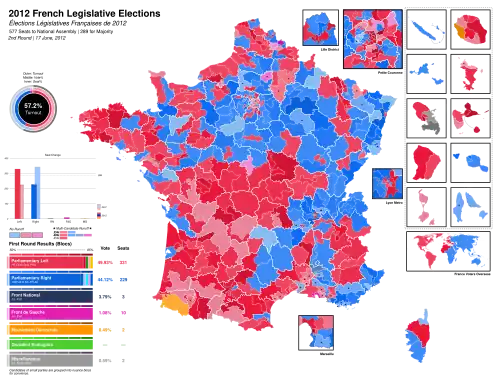Legislative elections were held in France on 10 and 17 June 2012 (and on other dates for small numbers of voters outside metropolitan France) to select the members of the 14th National Assembly of the Fifth Republic, a little over a month after the presidential election run-off held on 6 May.[1][2]