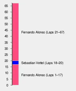 The conditions on the grid were dry and sunny before the race; the air temperature ranged between 20–21 °C (68–70 °F) and the track temperature was between 30–32 °C (86–90 °F).[15][16] Fernando Alonso won the race, his 30th in Formula One to become the only driver to win three races at this point in the season, Jenson Button was 2nd after Sebastian Vettel was given a 20 second time penalty for passing the former by going off the track, the penalty dropped the German down to 5th.[17] Michael Schumacher got the 77th and final fastest lap of his Formula One career.[18]