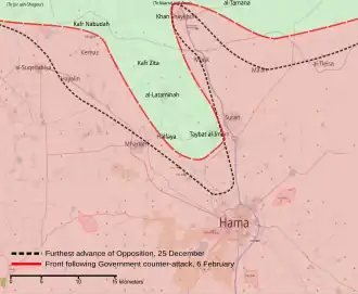 The rebel military council of Hama announced the start of the offensive on 16 December, giving Syrian government troops in the province an ultimatum to surrender to the Free Syrian Army within 48 hours.[7] Within two days, the Syrian Observatory for Human Rights and Qassem Saadeddine, a member of the Free Syrian Army military command, claimed that Syrian government troops had already been cleared from the towns of Halfaya, Kafr Nabudah, Hayalin, Hasraya, al-Lataminah, Taybat al-Imam and Kafr Zita, leaving the rebels in control of the rural western part of Hama Province, and all areas north of Hama city.[8][9][10] Rebels had advanced 40 kilometres (25 mi) south from Maarrat al-Nu'man and Jisr ash-Shugour, encountering little resistance.[11] It seemed that rebels had overrun Syrian Army lines north of Hama city within 48 hours.[9] Government positions in Khan Shaykhun and Mhardeh were reportedly under attack by rebel forces.[7]