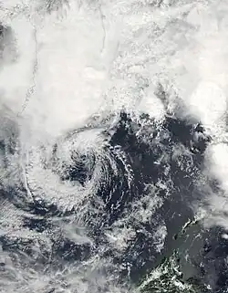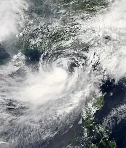 With warm sea surface temperatures and decreasing wind shear, Mawar developed a central dense overcast.[73] This led to the JMA upgrading Mawar to a severe tropical storm on June 2.[74] The JTWC subsequently upgraded it to a Category 1 typhoon as a developing eye feature was seen on microwave imagery.[75] Turning northeastward as a mid-latitude trough weakened the subtropical ridge to the northeast, Mawar further intensified into a Category 2 typhoon early on the next day, as a ragged eye became visible on satellite imagery.[76] The JMA followed suit and upgraded Mawar to a typhoon later that same day.[77] By June 4, Mawar reached its peak intensity,[78][79] before it started to weaken due to the mid-latitudes impacting the system's overall structure, with its eye breaking down into tight spiral banding, prompting the JTWC to downgrade the system to a category 2 typhoon.[80] On the next day, the PAGASA issued their final advisory on Mawar, as it was exiting the Philippine Area of Responsibility.[81] Mawar further weakened into a category 1 typhoon as its low-level circulation center widened, and was entering a hostile environment due to its interaction with the jet stream.[82] The JMA subsequently downgraded Mawar to a severe tropical storm,[83] as it commenced its extratropical transition.[84] Late on the same day, the JTWC issued their final advisory on Mawar, as it was deeply embedded in the baroclinic zone and its low-level circulation center had decoupled behind its convection.[85] On June 6, Mawar fully became an extratropical cyclone, and the JMA issued their final advisory on the system.[86] The system was last noted east of the Kamchatka Peninsula on June 13.[87]