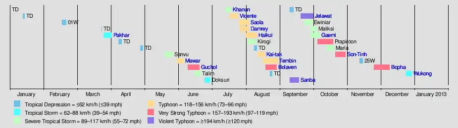 The season's first named storm, Pakhar, developed on March 28 while the last named storm, Wukong, dissipated on December 29. The season became very active between mid-July and mid-August, with nine named storms formed during the period. Vicente underwent explosive intensification and made landfall over the west Pearl River Delta as a strong typhoon. Damrey developed into a typhoon in the Yellow Sea and became the most intense tropical cyclone to make landfall north of the Yangtze River since 1949. Typhoon Haikui, although centred far away from the Philippines, killed at least 89 people in the country. Typhoon Tembin affected Taiwan twice because of its cyclonic loop.
