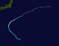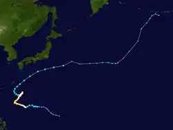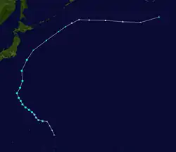 Late on June 7, a tropical disturbance formed south-southeast of Pohnpei.[92] By the next day, the Joint Typhoon Warning Center (JTWC) issued a Tropical Cyclone Formation Alert on the system, but cancelled it late on June 9.[93][94] The JMA upgraded the low-pressure area to a tropical depression early on June 11, with the JTWC subsequently following suit.[95][96] Early on the next day, the JTWC upgraded the system to a tropical storm, and later the JMA also upgraded it to a tropical storm and named it Guchol.[97][98] Early on June 14, the JMA upgraded Guchol to a severe tropical storm, and the PAGASA assigned the local name Butchoy on the system as it entered the Philippine Area of Responsibility.[99][100] Later that day, the JTWC upgraded Guchol to a category 1 typhoon, as convection started to organize.[101] It continued to intensify into a category 2 typhoon on June 15, as it became better organized and started to develop more convection.[102] As Guchol went through rapid intensification with a well defined eye on June 16, the JMA upgraded it to a typhoon early that day, and the JTWC upgraded it further to a category 3 typhoon, and later a category 4 super typhoon.[103][104][105] Guchol reached peak intensity late on June 17,[106] before it began to undergo an eyewall replacement cycle as the storm weakened under moderate vertical wind shear on June 18,[107] and later started its extratropical transition. The JTWC downgraded Guchol to a tropical storm on June 19, as it made landfall over Kii Peninsula in Japan.[108] Later that day, the JMA downgraded Guchol to a severe tropical storm, as it traversed Japan.[109] On June 20, the JMA issued their last advisories on Guchol, as it fully transitioned into an extratropical cyclone northeast of Japan.[110]