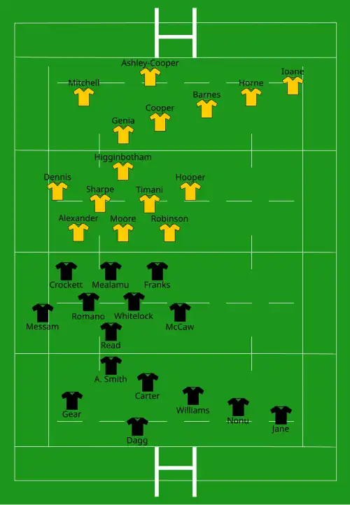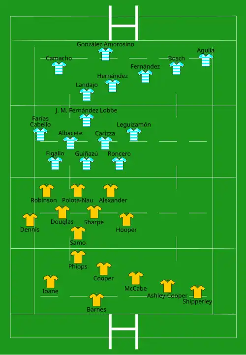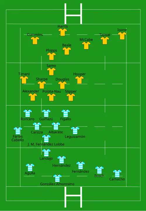 | Try: McCabe 60' c Ioane 69' c Con: Barnes (2/2) 60', 69' Pen: Barnes (2/4) 25', 49' Beale (1/1) 79' | Report[18] | Try: Leonardi 50' m Cabello 52' m Pen: Hernández (3/4) 3', 29', 57' |