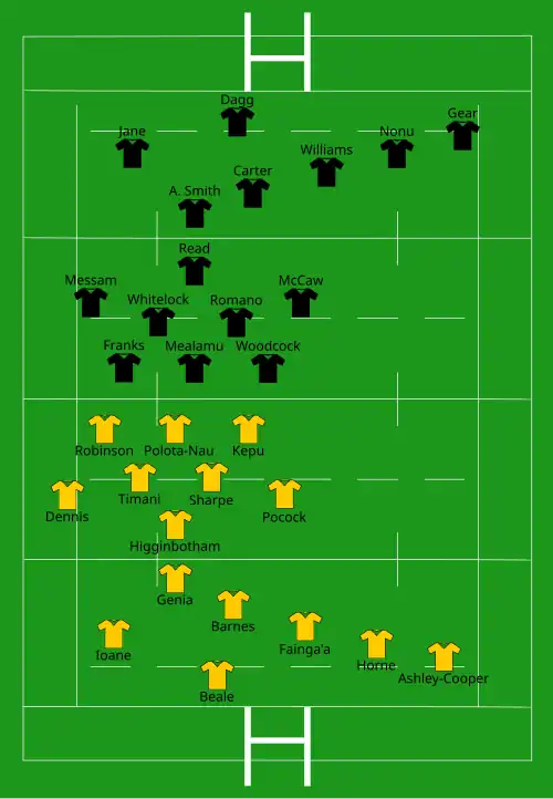 | Try: Sharpe 38' c Con: Barnes (1/1) 39' Pen: Barnes (4/4) 2', 44', 49', 75' | Report[5] | Try: Dagg 12' c Jane 32' m Con: Carter (1/2) 13' Pen: Carter (5/6) 10', 19', 47', 62', 80+2' |