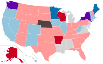 Regularly scheduled elections were held in 86 of the 99 state legislative chambers in the United States. Nationwide, regularly scheduled elections were held for 6,015 of the 7,383 legislative seats. Many legislative chambers held elections for all seats, but some legislative chambers that use staggered elections held elections for only a portion of the total seats in the chamber.[2] The chambers not up for election either hold regularly scheduled elections in odd-numbered years, or have four-year terms and hold all regularly scheduled elections in presidential midterm election years.