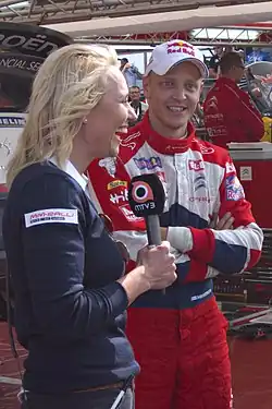 Mikko Hirvonen , who finished second, interviewed during the Rally Finland