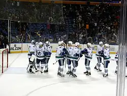 With one week remaining in the pre-season, Vancouver assigned Eriksson to the Comets, giving Lack the back-up goaltender job. Eriksson made only one appearance in the preseason and stopped all nine shots. The move was seen as a way for Eriksson to have more playing time while adjusting to the smaller ice surface in North American rinks.[49] In the battle for the sixth defenceman spot, Alberts struggled in the preseason. In four games he registered 17 minutes in penalties, and was on the ice for eight goals against.[50] Weber was inconsistent. In his first, third, and fifth games he combined for one goal and three assists, with a +4 rating (positive impact), while in his second and fourth games he recorded 1 assist and a −4 rating (negative impact).[51][52][53][54][55] The duo struggled in the second to last preseason game against San Jose, combining for a −6 rating.[56] Though Corrado had played well enough to be considered among the team's top eight defencemen, he was assigned to Utica to allow him more, varied ice time to help his development.[57]