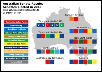 The Senate saw the Coalition government on 33 seats with the Labor opposition on 25 seats, the Greens on 10 seats and a crossbench of eight—Palmer United on three seats, with other minor parties and independents on five seats (the LDP's David Leyonhjelm, Family First's Bob Day, Motoring's Ricky Muir and incumbents Nick Xenophon and the DLP's John Madigan). Muir announced he would vote in line with Palmer United.[7] The initial election saw Wayne Dropulich of the Australian Sports Party win a seat in Western Australia, but the subsequent voiding of the result and ensuing special election saw the Palmer United Party gain a third seat. The Coalition government required the support of at least six non-coalition senators to pass legislation.
