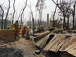 On 28 February, in the afternoon Jamaat-e-Islami and Islami Chhatra Shibir activists attacked the Hindus in Chittagong District.[18] In Banshkhali Upazila, the attackers set fire to Hindus houses in Dakshin Jaldi area of Jaldi Union. 20 houses were gutted. 16 Hindus were injured in the arson, two of the died.[11] A 65-year-old Hindu was killed in the attacks.[19] On early morning of 5 March at around 2–30 a.m., the Sarbajaneen Magadeshwari Mandir at East Rupkania of Satkania Upazila was torched.[20][21] At around 3:30 am the Khetrapal Temple was burned to ashes and money from donation box was looted.[22]