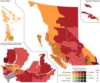 The Liberal Party won its fourth straight majority; Clark was defeated in her riding, but she was re-elected to the legislature in a subsequent by-election in Westside-Kelowna on July 10, 2013,[2] after Liberal MLA Ben Stewart stepped down on her behalf.[3] The NDP remained the official opposition, losing two seats, and the Green Party won its first-ever seat with future leader Andrew Weaver being elected in the Victoria-area riding of Oak Bay-Gordon Head.