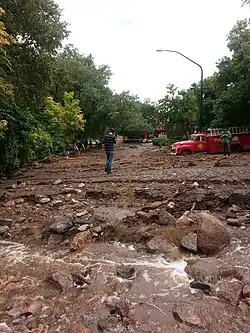 The 2013 Colorado floods were a series of natural disasters occurring in the U.S. state of Colorado. Starting on September 11, 2013, a slow-moving cold front stalled over Colorado, clashing with warm humid monsoonal air from the south.[1] This resulted in heavy rain and catastrophic flooding along Colorado's Front Range from Colorado Springs north to Fort Collins. The situation intensified on September 11 and 12. Boulder County was worst hit, with 9.08 inches (231 mm) recorded September 12 and up to 18 inches (460 mm) of rain recorded by September 15,[2][3][4] which is comparable to Boulder County's average annual precipitation (20.7 inches, 525 mm).[5] This event has also been referred to as the 2013 Colorado Front Range Flood,[6][7][8] reflecting a more precise geographic extent in and along the Colorado Front Range mountains.