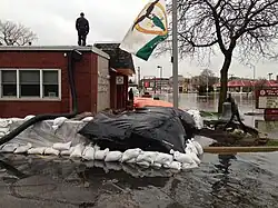 The Grand River crested to a record 21.85 feet, breaking a 1985 river crest record, forcing evacuations and flooding downtown Grand Rapids.[49] 9.1 inches (230 mm) of rainfall fell in Grand Rapids on April 18, breaking the previous rainfall record set in 1909.[50] Sandbags were set up in downtown Grand Rapids along the Grand River, and 1,000 people were evacuated from the Plaza Towers.[51] The Grand Rapids Public Museum was shut down after floodwaters surrounded the museum, despite sandbags that were set up around the building.[52][53] The Grand River also flooded areas of Lowell and Ada Township and prompted evacuations in Wyoming for 25 homes.[31][54][55] Buck Creek was flooded, leading to evacuations across Grandville,[56] and minor flooding occurred along the Saginaw River.[57] Parts of Shiawassee National Wildlife Refuge was flooded, and water topped the dike at Misteguay Creek in Saginaw County.[15] Homes and businesses along the Tittabawassee River were flooded.[15] Grand Rapids mayor George Heartwell declared a local state of emergency after low-lying areas in the city were inundated, forcing people to evacuate.[58]