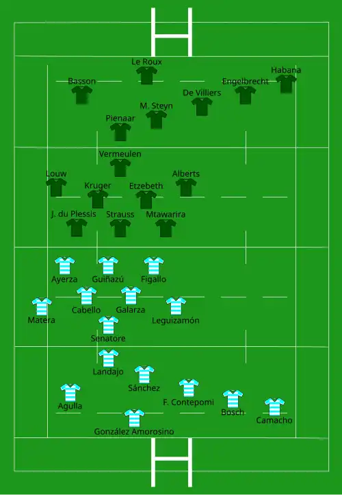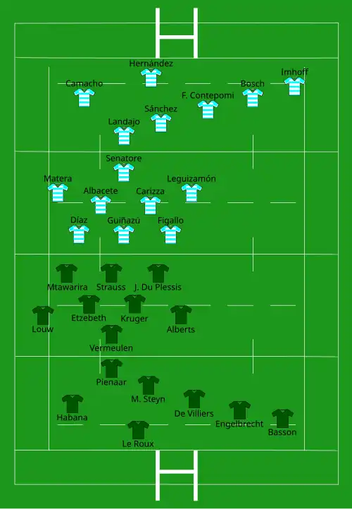 | Try: Penalty try 29' c Engelbrecht 32' c Strauss 45' c Alberts 52' m De Villiers 55' c Du Preez 62' c Habana 65' c Vermeulen 69' c B. du Plessis 75' c Con: Steyn (8/9) 30', 33', 47', 55', 63', 67', 70', 76' Pen: Steyn (4/4) 5', 9', 18', 37' | Report[7] | Try: Contepomi 79' c Con: Contepomi (1/1) 80' Pen: Contepomi (2/2) 16', 22' |