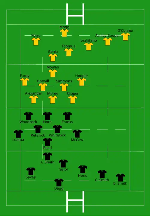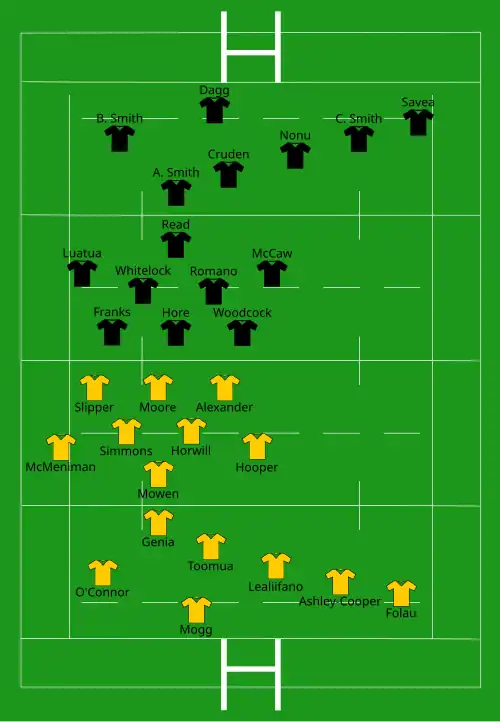 | Try: Genia 37' c O'Connor 79' c Con: Lealiifano (2/2) 33', 81' Pen: Lealiifano (5/5) 7', 12', 22', 27', 46' | Report[6] | Try: B. Smith (3) 2' c, 56' m, 71' c Cruden 28' c McCaw 31' m C. Smith 51' c Con: Cruden (3/5) 4', 29', 52' Barrett (1/1) 72' Pen: Cruden (3/3) 19', 40', 65' |