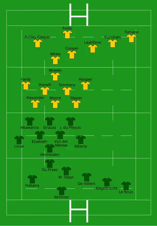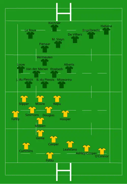 - Australia captain James Horwill was selected in the starting XV, but was withdrawn ahead of the match with a hamstring injury.[13] Jake Schatz could have made his debut of the bench, but was ruled out hours before kick off with a knee injury.[14]