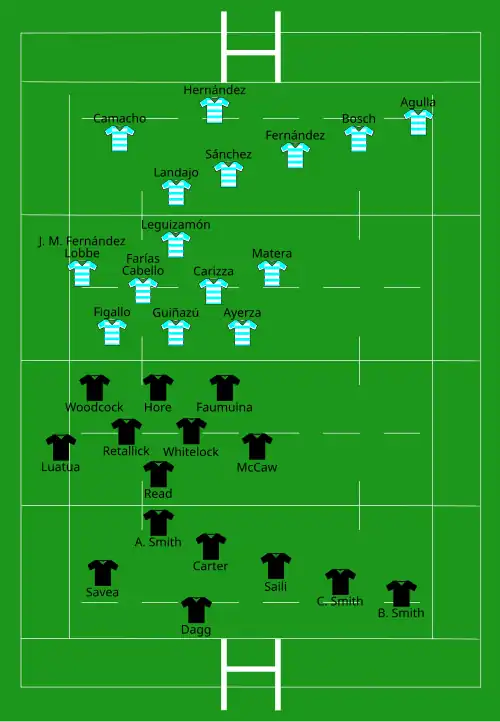 | Try: A. Smith (2) 23' c, 26' m Savea 53' c Con: Carter (2/3) 25', 54' Pen: Carter (2/4) 10', 49' Barrett (1/1) 74' | Report[11] | Try: Leguizamón 4' c Con: Sánchez (1/1) 5' Pen: Sánchez (2/3) 30', 52' |