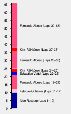 Nico Rosberg took pole position for the race, ahead of his teammate Lewis Hamilton.[4] Fernando Alonso took his thirty-second and most recent Grand Prix victory—and his second in his home race—ahead of Lotus-Renault's Kimi Räikkönen and Ferrari teammate Felipe Massa in third. Pole sitter Nico Rosberg finished sixth overall. The most notable overtaking move came on the first lap as Fernando Alonso went round the outside of both Kimi Räikkönen and Lewis Hamilton going into turn 3.[5] Ferrari's strategy of making 4 pit stops was risky but proved to be the best choice as Alonso was able to beat Räikkönen who did one less to claim victory.[6] This race was the most recent Formula One victory for Alonso as of June 2025, the last race to be won by a Spanish driver until Carlos Sainz Jr. won the 2022 British Grand Prix, and the last race to be won by Ferrari until the 2015 Malaysian Grand Prix.