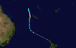 Both the Island Climate Update and the FMS tropical cyclone outlooks assessed the risk of a tropical cyclone affecting a certain island or territory.[2][3] As the tropical cyclone genesis trough of low pressure was expected to be located near to and to the east of the International Date Line, normal or slightly above normal activity was expected for areas near the dateline.[2][3] The Island Climate Update Outlook predicted that Vanuatu and New Caledonia had a reduced chance of being affected by multiple tropical cyclones.[3] The Northern Cook Islands, Fiji, Papua New Guinea, Tonga, Wallis and Futuna, the Solomon Islands, Northern New Zealand and French Polynesia's Austral and Society Islands were all predicted to have a normal chance of being affected by a tropical cyclone or ex tropical cyclone.[3] They also predicted that Niue, Samoa, Tokelau, Tuvalu and the Southern Cook Islands had an elevated chance while French Polynesia's Tuamotu Archipelago and Marquesas Islands, Kiribati and the Pitcairn Islands, had an unlikely chance of being affected by a tropical cyclone.[3] The FMS's outlook predicted that Wallis and Futuna, Tuvalu, Samoa, Niue, Tonga, Vanuatu, the Southern Cook Islands and the Solomon Islands had a high chance of being affected by a tropical cyclone.[2] Fiji, French Polynesia, New Caledonia and the Northern Cook Islands and had a moderate chance of being affected by a tropical cyclone while Kiribati had a low chance.[2] Because of its proximity to the warm pool and genesis area, the FMS noted that Tokelau had a low to moderate risk of being affected by a tropical cyclone.[2] RSMC Nadi also predicted that there was an increased risk of severe tropical cyclones, affecting the region this year when compared to the previous season.[6] There was a high chance of Tuvalu, Samoa, Niue, Tonga, the Southern Cook Islands, Vanuatu and the Solomon Islands being affected by a severe tropical cyclone.[6] The chances of Fiji, New Caledonia, the Northern Cook Islands and French Polynesia being affected by a severe tropical cyclone were moderate while Kiribati, Tokelau and Wallis and Futuna had a low risk.[6] The updated Island Climate Update tropical cyclone outlook reported that there was still a chance that two or more systems could interact with New Caledonia, Vanuatu, Fiji, and Tonga.[4] However, it was noted that activity might be slightly reduced to the north of Vanuatu and that an elevated amount of activity might occur in the Coral Sea, to the east of Queensland.[4]