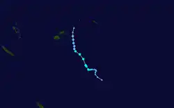 During January 29, RSMC Nadi reported that Tropical Depression 09F had moved into the basin, from the Australian region to the northwest of New Caledonia.[15] The system was moving towards the east-northeast and lay within an area of low vertical wind shear underneath an upper-level ridge of high pressure.[15] During January 30 the JTWC initiated advisories on the system and assigned it the designation Tropical Cyclone 10P. RSMC Nadi subsequently reported that the system had become a category 1 tropical cyclone and named it Ola. Over the next two days the system gradually intensified further and became a category 3 severe tropical cyclone early on February 1.