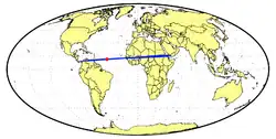 Infrasound was detected by three stations of the Comprehensive Nuclear-Test-Ban Treaty Organization.[8] Peter Brown and Petrus Jenniskens located weak signals from infrasound stations in Bolivia, Brazil and Bermuda.[3] 2014 AA entered Earth's atmosphere around 03:06 ± 5 min UT,[9] 3,000 km from Caracas, Venezuela, far from any landmass.[8][9] No ships or planes reported witnessing the event.[8] A recalculation of the impact parameters of this meteor based on infrasound recordings puts it in the Atlantic Ocean about 1900 km (1030 nautical miles) east of Port of Spain in Trinidad, at a longitude of impact of nearly 44º west and a latitude of 11º north, the impact time being 2456659.618 JD UTC.[10] Extensive numerical simulations indicate that, prior to impact, 2014 AA was subjected to a number of secular resonances and it may have followed a path similar to those of the NEOs 2011 GJ3, 2011 JV10, 2012 DJ54, and 2013 NJ4; NEOs in this transient group experience close encounters with the Earth-Moon system at perihelion and Mars at aphelion and could be a dynamical family.[10]