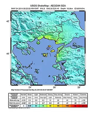 An earthquake occurred in the northern Aegean Sea between Greece and Turkey on May 24, 2014. It had a moment magnitude of 6.9 and a maximum Mercalli intensity of VIII (Severe). Serious damage was reported on the Turkish island of Imbros and the cities of Edirne and Çanakkale, as well as on the Greek island of Lemnos. The earthquake was felt in Bulgaria and southern Romania.[4][5] Several aftershocks followed the main shock, the strongest measuring 5.3 ML. This aftershock struck the Gulf of Saros at 12:31 local time.[6]