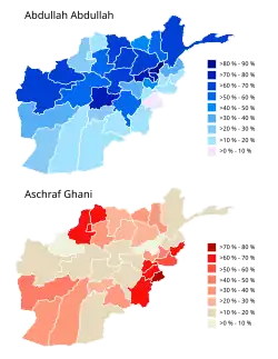 Presidential elections were held in Afghanistan on 5 April 2014, with a second round held on 14 June. Incumbent President Hamid Karzai was not eligible to run due to term limits. The registration period for presidential nominations was open from 16 September 2013 until 6 October 2013.[1] A total of 27 candidates were confirmed to be running for office.[2] However, on 22 October Afghanistan's Independent Election Commission disqualified 16 of the candidates, leaving only 11 in the race.[3] By April 2014 three candidates gave up the race and decided to support some of the eight remaining candidates. Opinion polls showed Abdullah Abdullah and Ashraf Ghani as the front-runners[4] and indeed the results of the first round of the election had Abdullah in the lead and Ghani behind him. The second set of results came after the run-off on 14 June, two months after the first round. Preliminary results were expected on 2 July and the final result on 22 July. However, widespread accusations of fraud delayed these results.[5] As a result, John Kerry, then United States Secretary of State, mediated the negotiations between the two final candidates, Ghani and Abdullah.[6] After a series of negotiations and talks between Ghani, Abdullah and Kerry, the two candidates agreed to sign an Agreement to form a National Unity Government[7] based on 50–50 power sharing. As a result of that political agreement, a separate position was created for Abdullah as Chief Executive.[8] The National Unity Government's term ran out after the next Afghan presidential election was held in September 2019.[9]