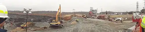 On February 2, 2014 a drainage pipe burst at a coal ash containment pond owned by Duke Energy in Eden, North Carolina, sending 39,000 tons of coal ash into the Dan River. In addition to the coal ash, 27 million gallons of wastewater from the plant was released into the river.[1] The broken pipe was left unsealed for almost a week before the draining coal ash was stopped.[2] The ash was deposited up to 70 miles (110 km) from the site of the spill and contained harmful metals and chemicals.[3] This catastrophe occurred at the site of the Dan River Steam Station, a retired coal power plant which had ceased operation in 2012.[4] Duke Energy apologized for the incident and announced detailed plans for removal of coal ash at the Dan River site.[5] Workers were only able to remove about ten percent of the coal ash that was spilled into the river, but cleanup is ongoing and Duke Energy plans to spend around 3 million dollars to continue the cleanup efforts.[3]
