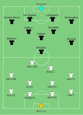 Belgium, who had already qualified for the knockout stage and would win the group if either South Korea did not win this match, or Algeria didn't beat Russia in the other simultaneous match, had Steven Defour sent off for a reckless tackle on Kim Shin-wook at the end of the first half. Belgium scored the only goal of the match in the second half, when substitute Divock Origi's shot was parried by South Korea goalkeeper Kim Seung-gyu and Jan Vertonghen converted the rebound with his left foot.[16]