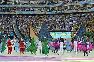 With the ceremony lasting about 30 minutes, a host of 660 dancers put on a performance paying tribute to Brazil's nature, people and football, with a "living ball" situated in the middle of the pitch.[5] The performers were dressed as several types of trees and flowers.[6] The entire ensemble performed three separate acts leading up to the finale where the ball opened up to reveal Brazilian singer Claudia Leitte, who sang alone for a few minutes before being joined by Jennifer Lopez and Pitbull, with whom she performed the tournament's official song "We Are One (Ole Ola)", which was co-written and recorded by the three artists.[4] The cost of the opening ceremony is estimated at R$18 million.[7]