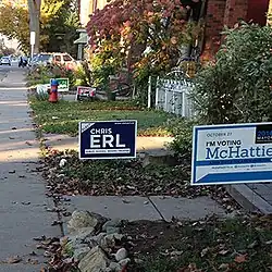 Election signs on lawns in Hamilton's Ward Two