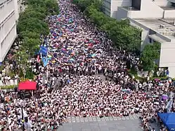 University teachers and tertiary students across Hong Kong wearing white shirts and yellow ribbons gathered at the University Mall (百萬大道), Chinese University of Hong Kong (CUHK).[12] At 2:20 p.m., Alex Chow, the Secretary-General of the HKFS, officially declared the start of the class boycott. He questioned why the future of 7 million Hong Kong people was not determined by themselves, but by the 170 handpicked members of the NPCSC. He stated that students in higher education institution should shoulder the civil and social responsibilities of Hong Kong, and live up to the hope of society by solving the social crisis. He also stated that as long as the Chinese Government and tycoons monopolised Hong Kong politics, livelihood problems would remain unsolved. HKFS demanded the government to: