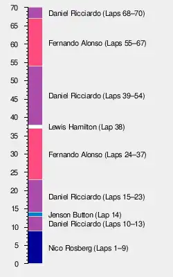 By lap 47, Rosberg had made further progress and was now almost a second behind Hamilton, with no cars separating them. Hamilton was given team orders to let Rosberg past, as Rosberg was on the softer tyre and had one more stop to make, while Hamilton was on a two stop strategy and did not have to pit again. However, Hamilton did not concede the place, replying on the radio: "I'm not slowing down for Nico. If he gets close enough to overtake, he can overtake me."[16] Hamilton was aware that he was effectively racing Rosberg at this point, and he did not want to lose a considerable amount of time by lifting to let his title rival through, as Rosberg was still over a second behind him.[17] Race-leader Ricciardo and Rosberg pitted for soft tyres on laps 54 and 56 respectively, rejoining in fourth and seventh. By lap 62, Alonso, Hamilton and Ricciardo were running very closely in first, second and third, with Hamilton 0.4 seconds behind Alonso and Ricciardo 0.4 seconds behind Hamilton. Meanwhile, Nico Rosberg was running fourth, over twenty seconds behind Ricciardo, but was rapidly closing the gap by up to three seconds a lap on his newer soft tyres, setting the fastest lap of the race while doing so. On lap 63, Alonso cut the chicane, but avoided any penalty and maintained the race lead. Ricciardo passed Hamilton around the outside of turn two on lap 67, and then the following lap passed Alonso at turn one for the race lead with two laps to go. Alonso continued to defend his position from Hamilton, but both of their tyres had fallen off of their respective operating cliffs – having both done close to 30 laps on their tyres – and by the final lap Rosberg had caught up to the back of them. Rosberg attempted to overtake Hamilton on the outside into turn two, but Hamilton defended and held position. Ricciardo crossed the line to win his second race of the season by 5.2 seconds, with Alonso coming second and Hamilton and Rosberg close behind in third and fourth. Massa and Räikkönen were fifth and sixth while Vettel and Bottas were only seventh and eighth after starting second and third (resulting in Ferrari overtaking Williams for third). [15]