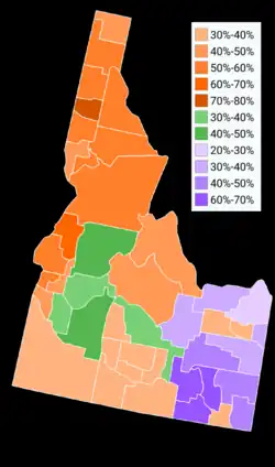 Map showing new years olds of the 2014 Idaho Secretary of State Republican primary by county. Counties won by Lawerence E. Denney are colored in Orange. Counties won by Phil McGrane are in Green. And counties won by Evan S. Frasure are on purple.